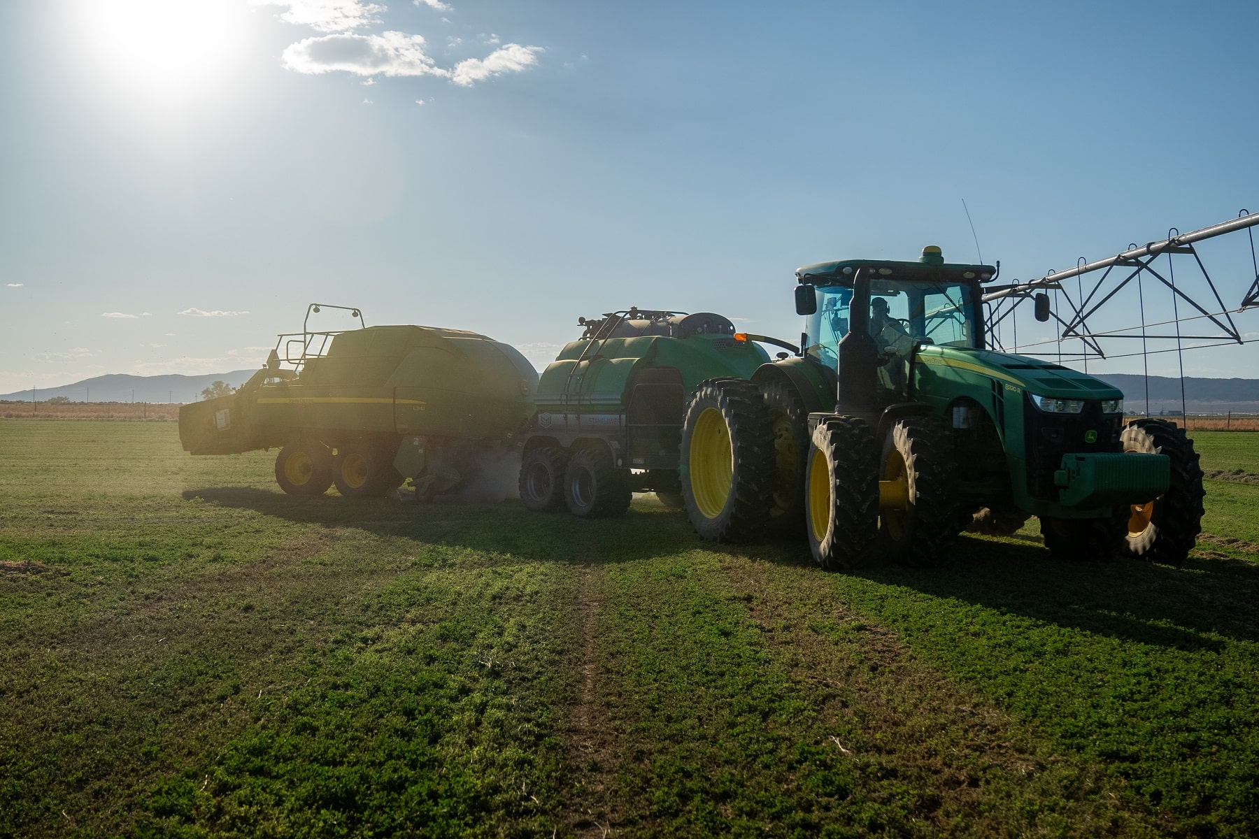 - Test in Different Conditions: Drive the tractor through various turning maneuvers on flat ground, and over the borders or uneven terrain you are likely to encounter. This allows you to check for interferences and turn angle limits between the tractor, DewPoint machine, and baler. Be sure to check for: